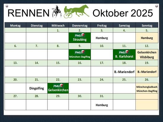 ++ München: Mit Ustinov steuert Josef Franzl seinen 1500. Sieger ++ ++ Enghien: In einem Nachwuchsreiten springt Stall Germanias Bayard (Mathias Potier) bereits im ersten Bogen, Stall Habos Kate Baldwin (Aurélie Gervais) nach langer Führung in der Entscheidung geschlagen - Familie Pellanders Velten Riesling (Benjamin Rochard) kommt im Prix d'Etain (41.000 Euro) für Fünfjährige nach einem Rennen hinter der Spitze im Finish kaum zur Entfaltung und ist als Sechster in 1:15,5/2875 Meter klar unter Wert geschlagen - Nicolas Matisse (Marciano Hauber) stets im Hintertreffen - Joachim Jochems Le Petit Jeu (Sébastien Baude) nach zwei Siegen in der Provinz auf der großen Bahn 2. in 1:14,5/2875 Meter ++ ++ Rättvik: Patrick Maleitzkes Zamba Zamba S (Jenny Björk) 6. in 1:15,0/1640 Meter - Karin Walter-Mommerts X.X.X.In (Per Linderoth) nach Fehler 11. in 1:15,7/1640 Meter - Gestüt Lasbeks Ultimus (Daniel Redén) 2. in 1:14,7/2140 Meter ++ ++ Wolvega: Im TCT Satellitenrennen für Zweijährige die Maleitzke-Schützlinge Beautiful Mind S (Jim Veldman) und California Dreamin S (Hanna Huygens) 4. und 5. - Im Reiten Maja Thamm mit Leader Castelets upl., Marlene Matzky mit Heavenly Dreamgirl 3. in 1:16,4/2100 Meter, Ronja Walter mit Orange Crush 2. in 1:15,2/2100 Meter - Heinz Bergers Kitty des Sources (Jaap van Rijn) im TF für Stuten 1. in 1:15,4/2100 Meter - Im Rahmen Nadine Adams Val de Loire (Micha Brouwer) 7. in 1:15,9/2100 Meter ++
