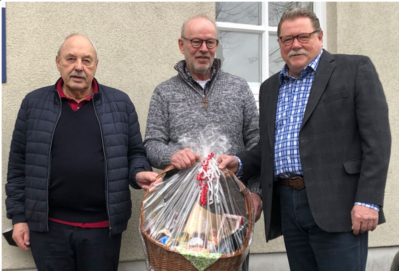 Um ihm in gebührender Art und Weise den Dank des Rennvereins für die bemerkenswerte Dienstzeit - von allen Rennbahnmitarbeitern war er zuletzt einer dienstältesten - auszusprechen, ließen es sich Elmar Eßer und Rolf Fränken vom Vorstand des Rennvereins nicht nehmen, ihn in Krefeld zu besuchen. Natürlich nicht mit leeren Händen: Neben dem herzlichen Dank und den besten Wünschen für die Zukunft wurde der Abschied mit einem Präsentkorb versüßt