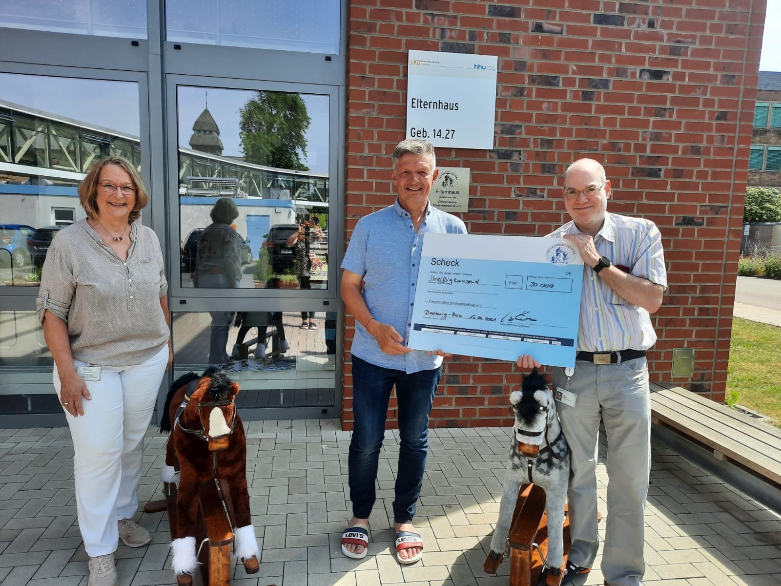 (heisterfeldshof-press) Uwe Zevens hatte gehofft, den Scheck etwas früher offiziell überreichen zu können, doch die Corona-Pandemie machte ihm einen Strich durch die Rechnung. Mitte dieses Monats war es nun aber soweit. Der Chef auf dem Heisterfeldshof und Initiator der Aktion For Children Living machte sich auf den Weg zur Düsseldorfer Kinderkrebsklinik und händigte dem Vorstand der Elterninitiative das 30.000 Euro-Papier aus.