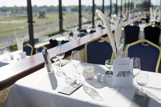Das Buffet-Restaurant im dritten Obergeschoss des großen Tribünenhauses: Ein exklusiver Gästebereich mit Wohlfühl-Garantie! Die erhöhte Perspektive sichert Ihnen besten Blick auf das Renngeschehen. Von den perfekt angeordneten Tischen aus können Sie jedes spannende Renndetail hervorragend beobachten. Die vollverglaste Fensterfront schützt Sie vor Wind und Wetter, damit Sie Ihr Festmahl ungestört genießen können.