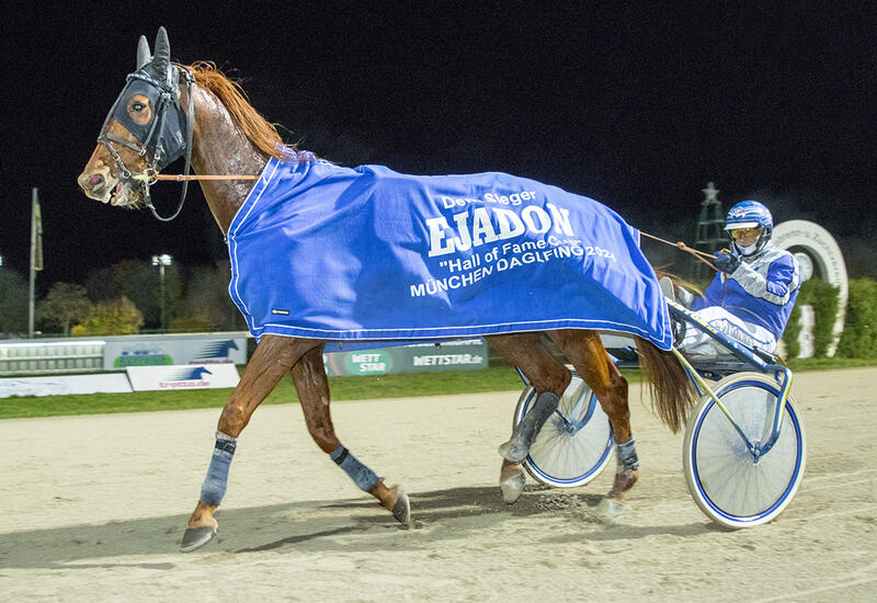 Auch im sportlichen Highlight der Karte ging der Sieg an den Mann in den blau-grauen Rennfarben. Bereits im Siegerinterview von Velten Chicago kündigte Platzer an, am Start mit Postillion alles auf eine Karte setzen zu wollen, um die Spitze zu erobern. Den Worten folgten Taten, denn Postillion kam im Ejadon Hall of Fame-Cup vorzüglich vom Start, eroberte die Spitze und dominierte nach einem ersten Kilometer in 1:22 das Geschehen in der Folge überlegen.