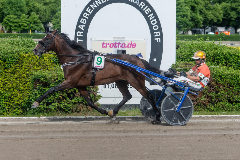 Im Trabreiten setzte Sarah Kube mit dem 19,2-Außenseiter Jerry ein dickes Ausrufezeichen. Der in Tschechien gezüchtete Wallach ging von der 2.000-Meter-Grundmarke aus sofort nach vorne und ließ die unentwegten Angriffe des mit Zulage bedachten Staccato HL (Hannah Schmitz) in 1:15,1 min. völlig unbeeindruckt an sich abprallen. Am Ende war Jerry sogar mit einem Vorteil von vier Längen voraus.