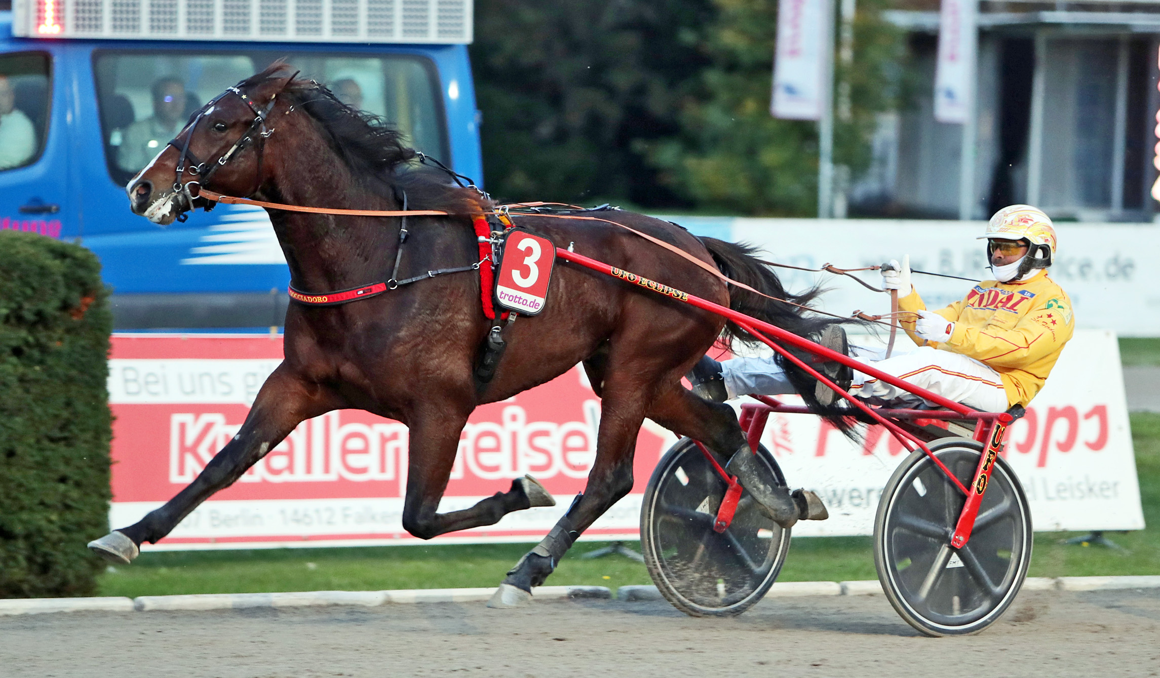 Für den tollen Auftritt seines Schützlings erhielt Alessando Gocciadoro natürlich reichlich Applaus. Aber noch kräftiger wurde der Sieger des Hauptlaufs der vierjährigen Stuten vom begeisterten Publikum gefeiert. Tim Schwarma vollbrachte mit Paul Kuhsträters Isla eine Sensation und gewann Start bis Ziel. Für Schwarma, der seit Jahren zu den besten Fahrern in Deutschland gehört, aber von den Besitzern leider viel zu selten für wirkliche Spitzenpferde in Anspruch genommen wird, war es der größte Sieg seiner fahrerischen Laufbahn – und der sympathische Profi hatte diesen Erfolg ebenso wie das gesamte Team von Isla wahrlich mehr als verdient.
