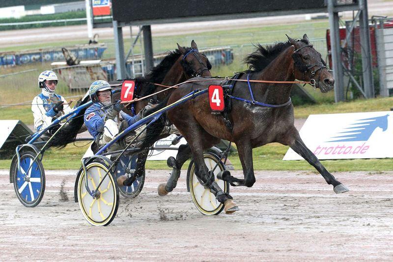 Ebenfalls weiter auf Siegkurs segelte Joe Cocker, der bereits in Dinslaken von der Spitze aus hingekommen war. Nach identischem Muster sicherte er sich mit Niels Jongejans den 1. Vorlauf zum Juni-Pokal und ließ dem außen herum gehenden Favoriten Jambers keine Chance. Nahema als Dritte war so formgemäß wie Dolce Gabbana überraschend, da gab es in der Viererwette sensationelle 2.842,5:1.