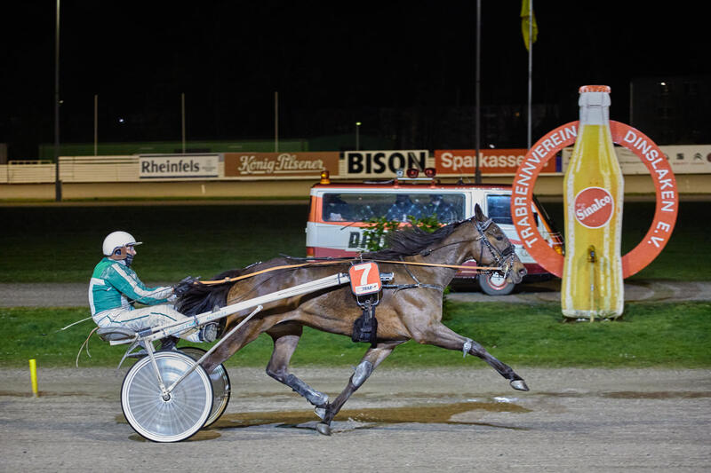 (dintrab-press/MT) Mit einer in jeder Hinsicht interessanten Abendveranstaltung beendete die Trabrennbahn am Dinslakener Bärenkamp den Monat März. Im Mittelpunkt stand neben dem mit ansehnlichen 3.400 Euro dotierten Wertungslauf zur Rheinfels-Serie vor allem die V6-Wette. Dank eines am vergangenen Renntag entstandenen Jackpot von fast 2.500 Euro fanden die Wetter sie so interessant, dass allein der V6-Umsatz ein fünfstelliges und damit selten gesehenes Ausmaß erreichte.