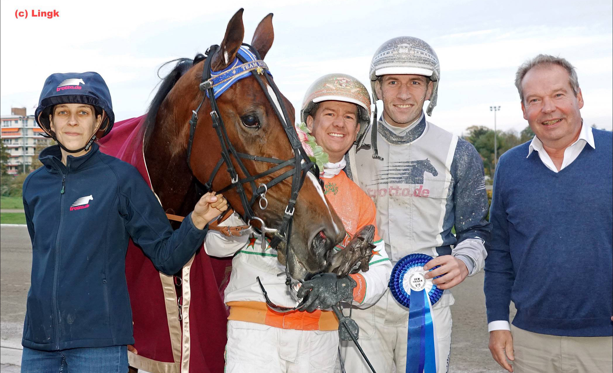Doch am Ende wurde eine faustdicke Überraschung zur Realität. Denn es war nicht das Team von Nortolanda, das nach dem Hauptlauf der vierjährigen Stuten im Winner-Circle erschien. Sondern die Mannschaft von Michael Nimczyk, der die von Koop Bijerk gezüchtete Naikey aus dem Besitz von Karin Walter-Mommert zu einem grandiosen Triumph gesteuert hatte.