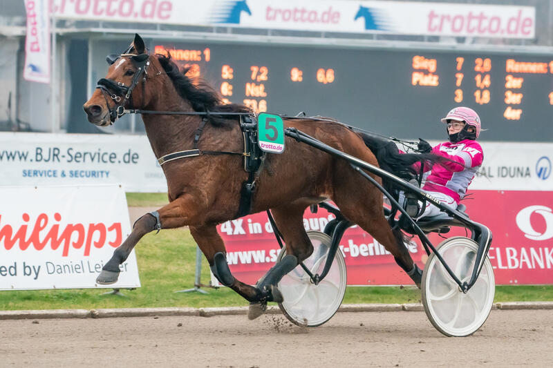 (BTV-press) Graue Wolken am Himmel, aber deutlich milder: Genau rechtzeitig zur Berliner PMU-Matinée waren Schnee und Eis weitaus angenehmeren Temperaturen gewichen. Der ungewohnte Samstag-Termin bot zum Auftakt gleich einen überaus lukrativen Sieger, denn der von Marlene Matzky gesteuerte Majestic trumpfte Start-Ziel auf und zahlte trotz der starken niederländischen Formen, die der Vierjährige im Handgepäck mitgebracht hatte, den 7,2-fachen Siegeinsatz aus.