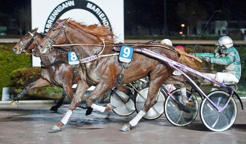 Kornelius Kluth war für den erkrankten Jani Rosenberg für die Fahrt mit Waikiki Fortuna eingesprungen und legte prompt eine perfekte taktische Leistung hin, denn er servierte der Stute einen Idealverlauf als zweites Pferd innen. Gegen den Piloten Hockstedt (Victor Gentz) hätte es vermutlich aber dennoch nicht gereicht. Doch als dieser – völlig ohne Not – beim Einbiegen auf die Zielgerade ansprang, wurde Waikiki Fortuna schlagartig schnell und fing auch Pandroklus Eck (Thorsten Tietz), der zwischenzeitlich die Nüstern in Front gesteckt hatte, noch sehr sicher ab. Dass Waikiki Fortuna trotz der regennassen Piste rasante 14,9/1.900m trabte, spricht zudem Bände über das Leistungsvermögen der Braunen.