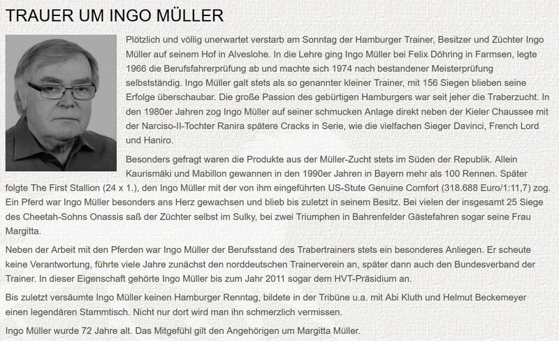 Plötzlich und völlig unerwartet verstarb am Sonntag der Hamburger Trainer, Besitzer und Züchter Ingo Müller auf seinem Hof in Alveslohe. In die Lehre ging Ingo Müller bei Felix Döhring in Farmsen, legte 1966 die Berufsfahrerprüfung ab und machte sich 1974 nach bestandener Meisterprüfung selbstständig. Ingo Müller galt stets als so genannter kleiner Trainer, mit 156 Siegen blieben seine Erfolge überschaubar. Die große Passion des gebürtigen Hamburgers war seit jeher die Traberzucht. In den 1980er Jahren zog Ingo Müller auf seiner schmucken Anlage direkt neben der Kieler Chaussee mit der Narciso-II-Tochter Ranira spätere Cracks in Serie, wie die vielfachen Sieger Davinci, French Lord und Haniro.