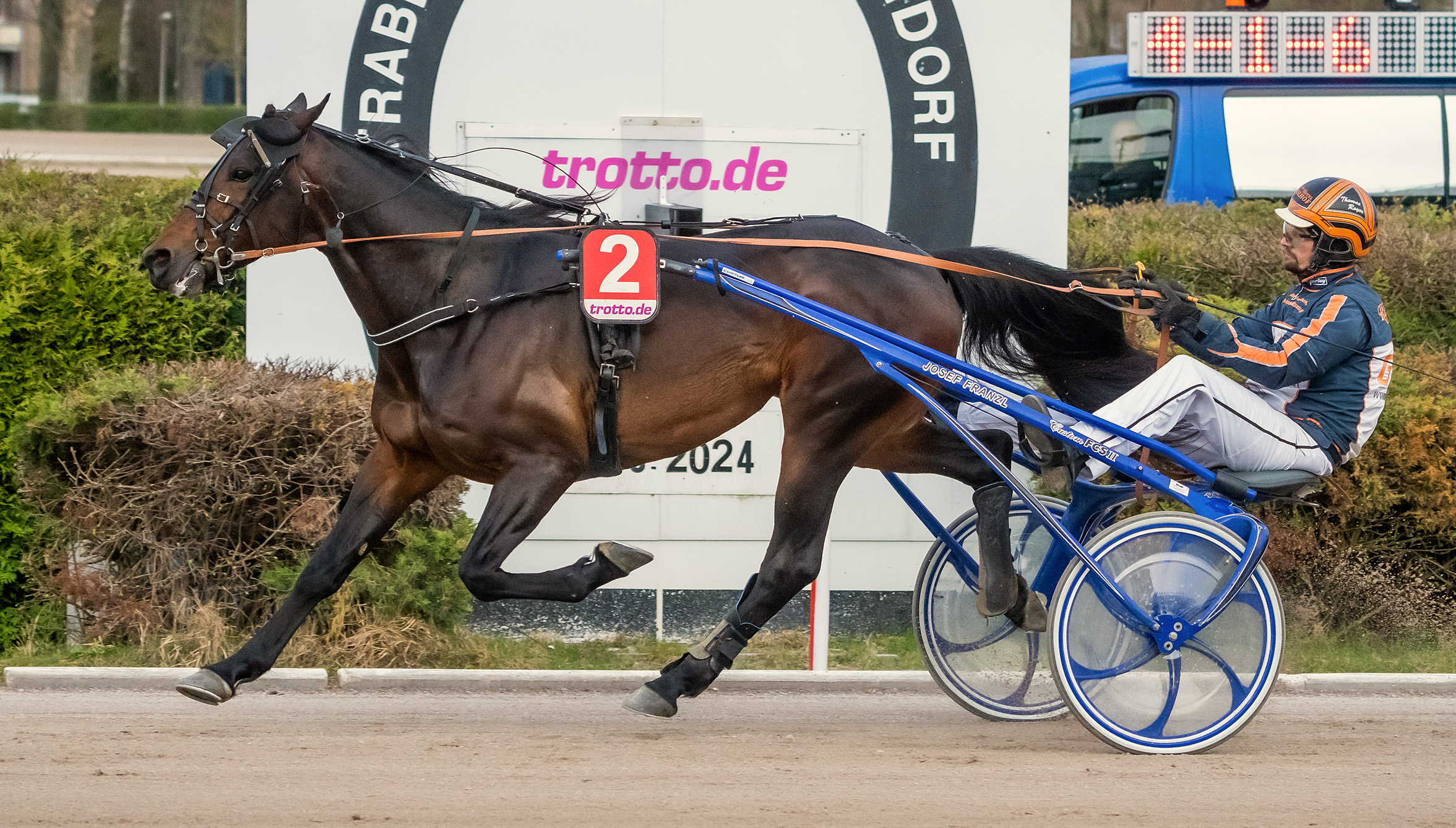 Besonders viel scheint sich Versace Diamant für diese Saison vorgenommen zu haben.Mit seinem Besitzer Tom Karten im Sulky blieb der Wallach auch beim dritten diesjährigen Start ungeschlagen und übernahm noch auf der Startgeraden das Kommando, das er in 14,2/1.900m nicht mehr abgab.
