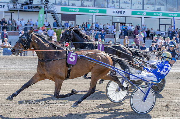 Wie im Vorjahr ging die 4-års-Eliten um 205.000 dänische Kronen, in der Schampus nicht ganz unerwartet gegen sehr viel erfahrenere Mitstreiter beim sechsten Auftritt das erste Mal das Gefühl einer Niederlage auskosten musste, an ein in Amerika geborenes Ross, das Bo Westergaard für den dänischen Stall von Preben Munch Kjærgaard vorbereitet - mit dem kleinen Unterschied, dass nicht wie 2022 bei Seven Nation Army als Vollstrecker Nicklas Korfitsen im Sulky saß, sondern der Trainer höchstpersönlich.