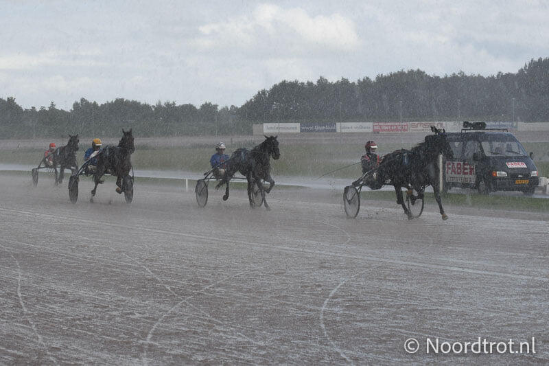Zudem hatte Hurricane einen ausgeprägten schwarz-rot-goldenen Hintergrund, der von Jürgen Hanke wie so viele seiner Traber ins dänische Register eingetragen worden war und Roman Thomaskamps Farben trug. Für die als deutlicher 20:10-Favorit hochgezogene Nummer eins des Hagoortschen Quartiers war bereits am Start Schluss mit Trab. Sein Trainingskamerad Pearl Vrijthout, ohnehin Schlusslicht, folgte ihm nach 600 Metern an den Sünderturm, so dass der Erfolgscoach ausnahmsweise mal in die Röhre guckte.