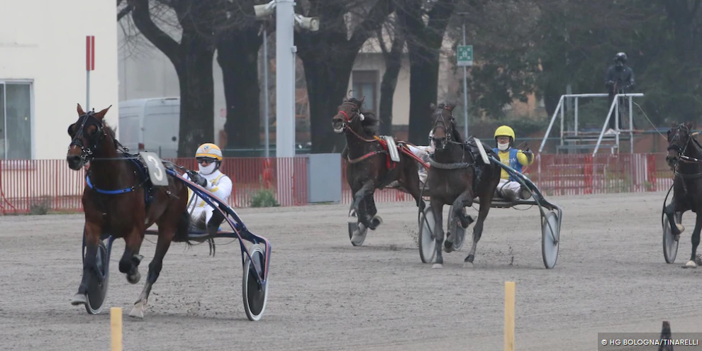 (nn) Bologna, Sonntag, 20. Dezember 2020. Kurz vor Saisonende durften die einheimischen Dreijährigen noch einmal in den propper gefüllten Prämientopf langen. Auf dem 800-Meter-Oval des Ippodromo Arcoveggi warteten im Gran Premio Italia je 50.500 Euro auf jene „Maschi” und „Femmina” des „B“-Jahrgangs, die noch immer in Betrieb waren. Natürlich lockte das eine ganze Schwadron von Gocciadoro-Trabern in die Hauptstadt der Emilia-Romagna - insgesamt stellte der 45-jährige zehn der 23 Starter -, doch lief’s bei den „Jungmannen“, bei denen das Team nur die Prämien vier und fünf schnappte, unter dem inzwischen üblichen Schnitt.