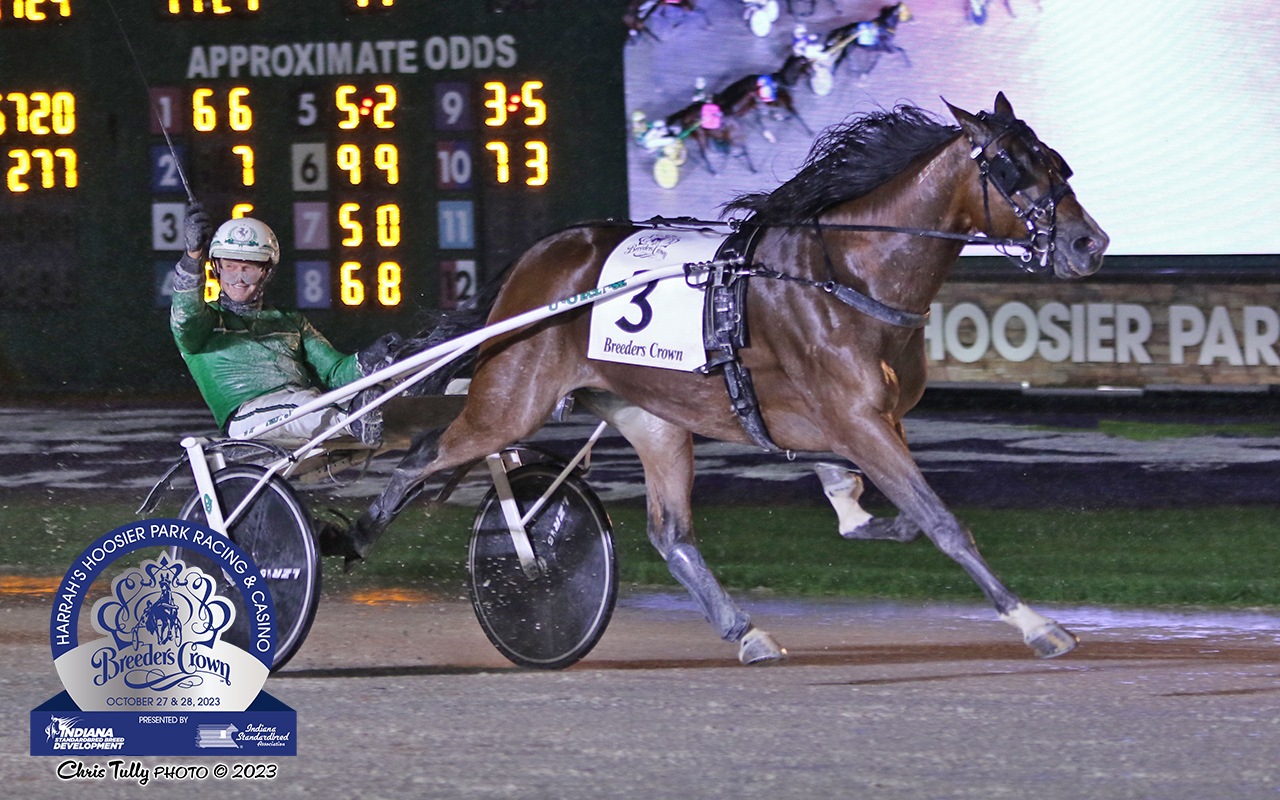 Anderson / Indiana, Samstag, 28. Oktober 2023. Die zweite Session der diesjährigen Breeders-Crown-Saga auf dem 1.406 Meter weiten Oval des Hoosier Park von Andersen war den dreijährigen und älteren Recken vorbehalten.