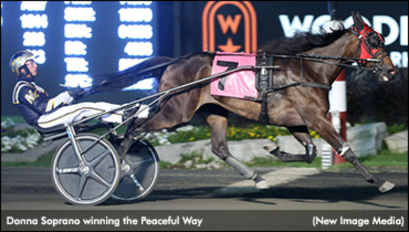 Campbellville / Ontario, Samstag, 12. September 2020. Einen goldenen Abend erlebten Trainer Luc Blais und der in Montreal lebende Besitzer Serge Godin des Determination Stable, die sich gemeinsam beide hochdotierten Zweijährigen-Matches der trabenden Fraktion einklinkten. Im Peaceful Way Trot, der an die legendäre, mit 3,2 Millionen Dollar als reichstes je in Kanada gezüchtetes Standardbred 2007 abgetretene Stute erinnert (ihr zu Ehren wurde der Oakville Trot 2008 umbenannt), war Donna Soprano ganz klar die Primadonna und erledigte nach vier vorherigen Siegen auch die fünfte Ausfahrt so, wie die Fans es bei 13:10 von ihr erwarteten.