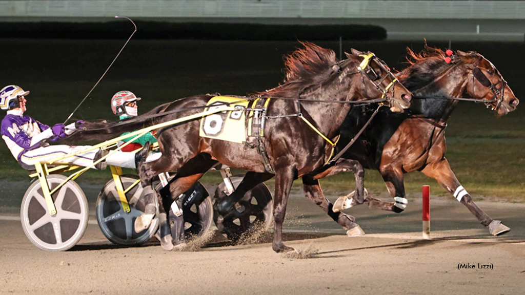 Man kann ziemlich sicher sein, dass es an diesem Freitagabend gewesen wäre, hätte sich der Traum eines jeden Besitzers erfüllt, solch ein Pferd siegreich zu verabschieden. Lange sah es auch ganz danach aus, als solle dem Hengst beim 98. Auftritt dieser emotionale Coup gelingen, obwohl er für eine Halbmeilen-Bahn wie Yonkers an der „6“ nicht optimal aufgestellt war. Sein Standardfahrer Dave Miller legte los wie nix Gutes, doch die gleiche Idee hatte der direkt unter ihm postierte Jordan Stratton mit Take All Comers.