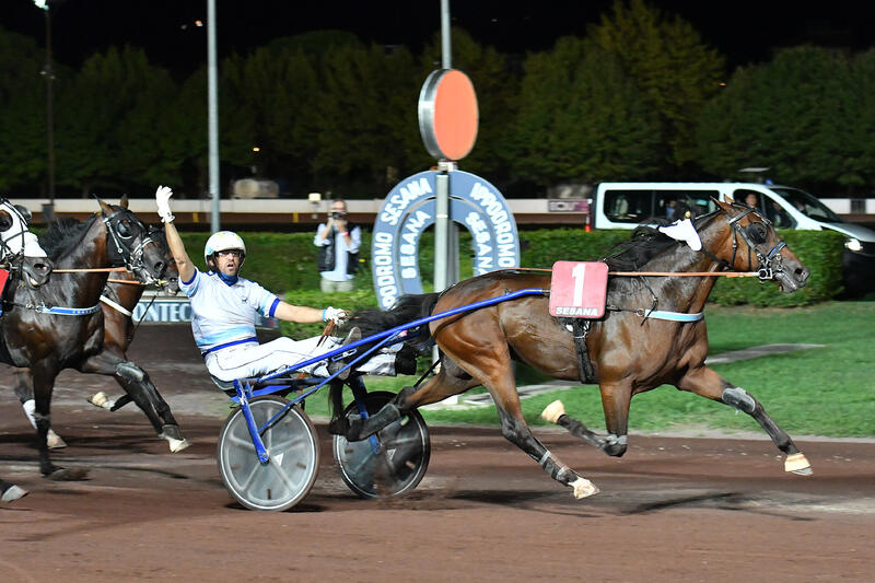 Nach Platz fünf in Cesena am 6. August warf Riccardo Pezzatini den für eigene Kasse laufenden City Lux erst zum zweiten Mal in eine halbklassische Schlacht - und holte mit dem zuvor elffachen Sieger zum unerwarteten großen Schlag aus. Dabei lief es zunächst für die 2½ Runden nicht mal sonderlich vielversprechend für den an der „1“ aufgestellten Wishing-Stone-Hengst, der am Start Canarino Jet (3) vor sich akzeptieren musste und nach dem Führungswechsel ausgangs der ersten Biege zu Collier (5) nur noch innerer Dritter war.