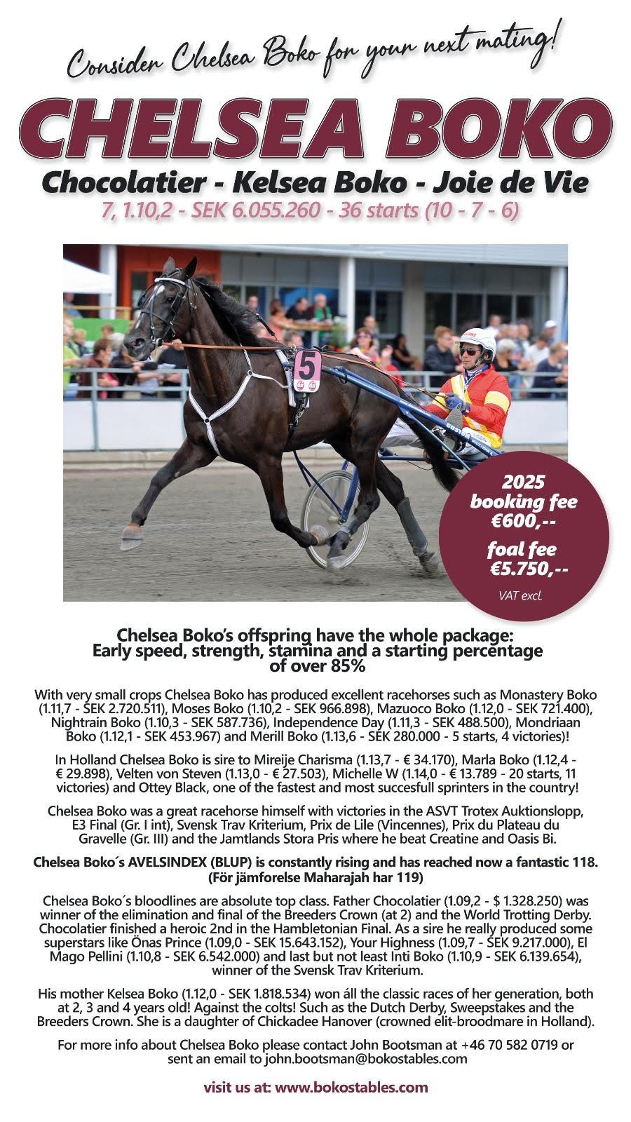 Das Pferd wird verkauft, einschließlich der bereits gezahlten Fohlengeldgebühr von 5750 SEK. Chelsea Boko ist ein Hengst, für den immer mehr Interesse aufkommt und den wir künftig häufig auf den Rennbahnen sehen werden.