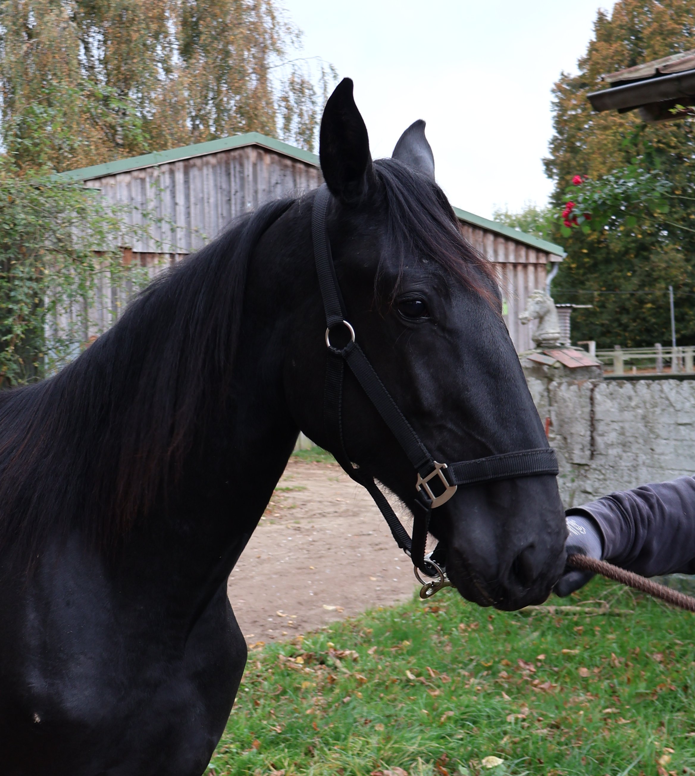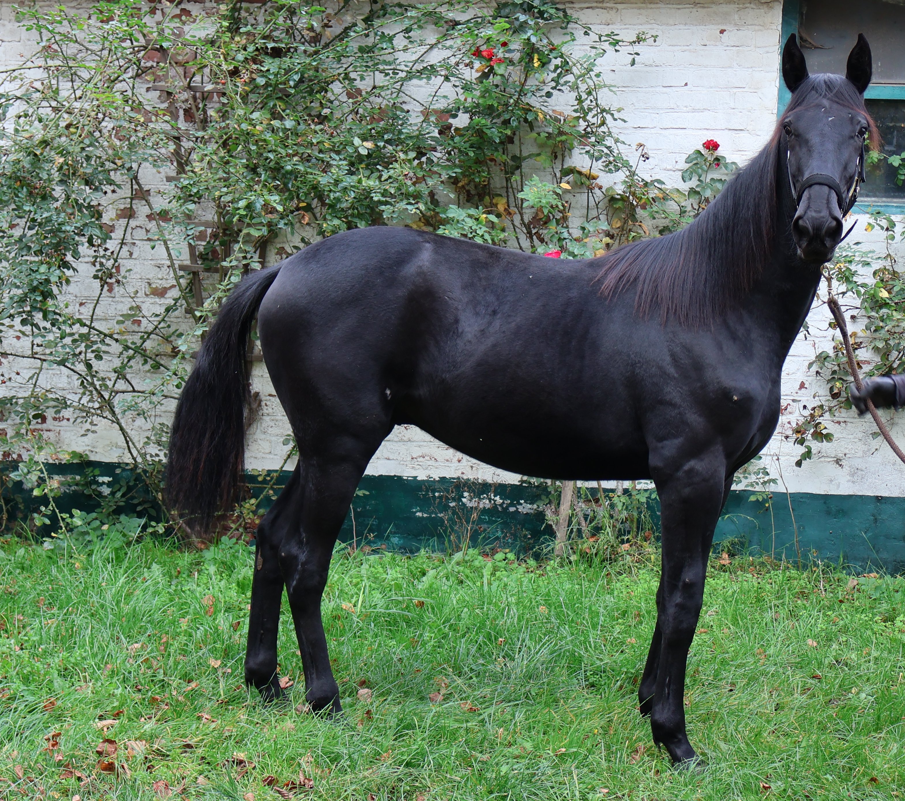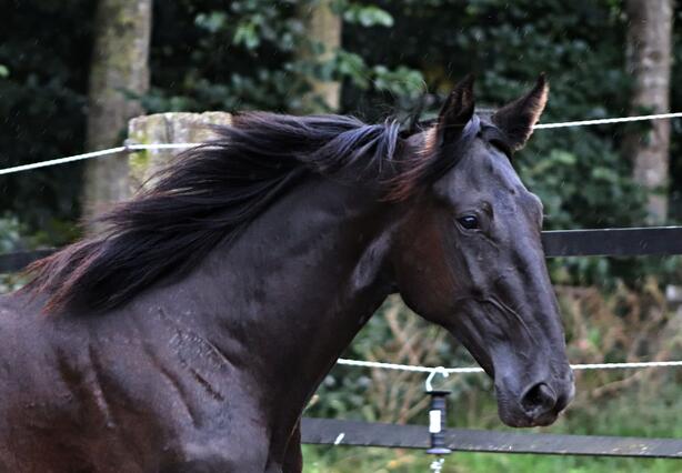 Der junge Rappe wächst derzeit auf dem Gestüt Helenenhof auf – in artgerechter Haltung, bestens betreut und gesund entwickelt.