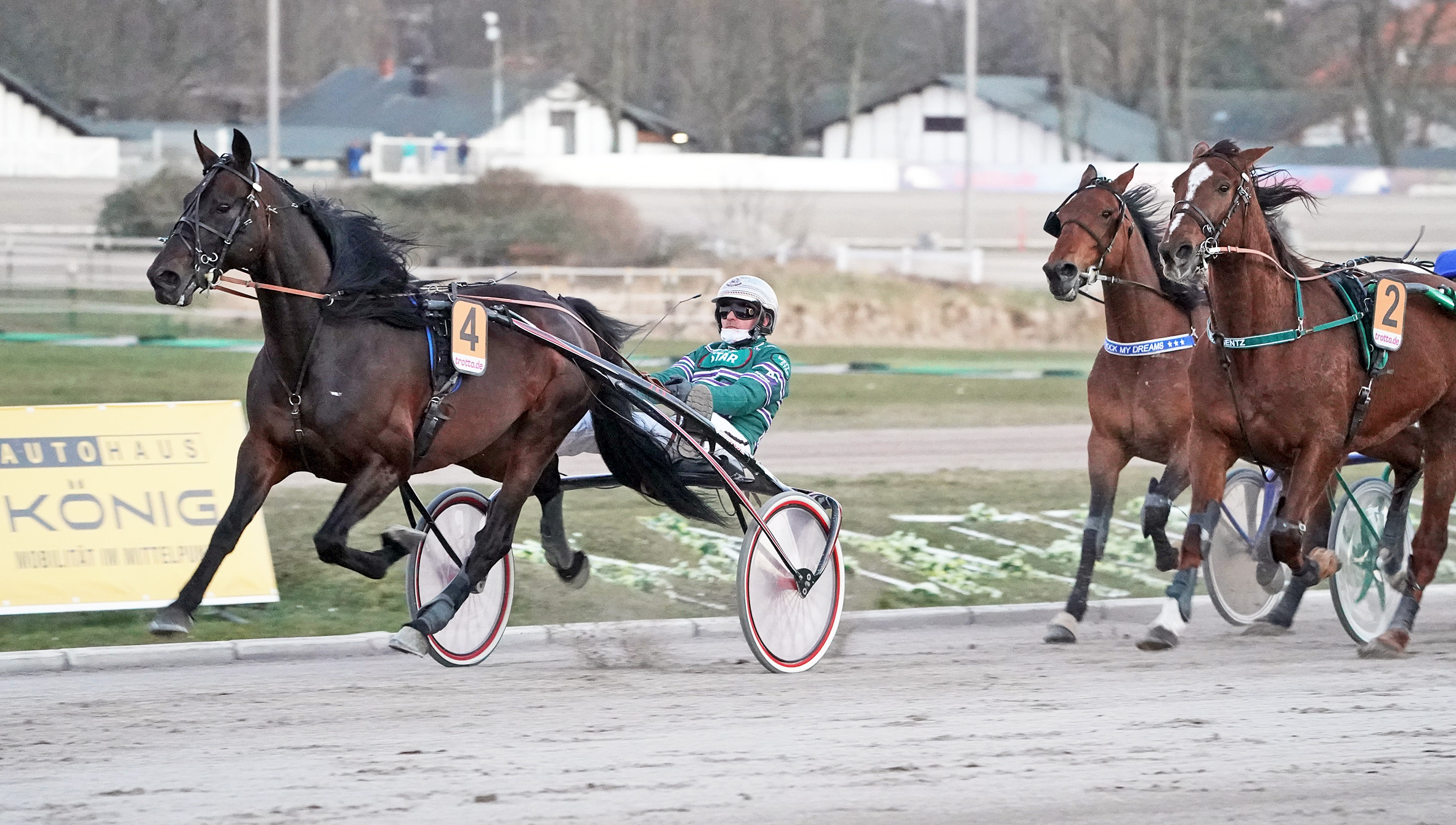 Das Mariendorfer Publikum richtete seinen Blick aber nicht nur auf die Menschen in der Ukraine, sondern gedachte auch des am 28. Februar verstorbenen Berliner Züchters Hans-Joachim Kleemann. Dem „Stall Preussen“-Besitzer war ein Rennen der internationalen Klasse gewidmet, das zwar nur fünf Teilnehmer aufwies, die aber exquisite Qualität verkörperten. Das „Prädikat wertvoll“ verdiente sich vor allem der großartig aufgelegte Halva von Haithabu, der in der Hand von Thorsten Tietz keinen Zweifel an seiner Autorität aufkommen ließ und sofort die Spitze übernahm.