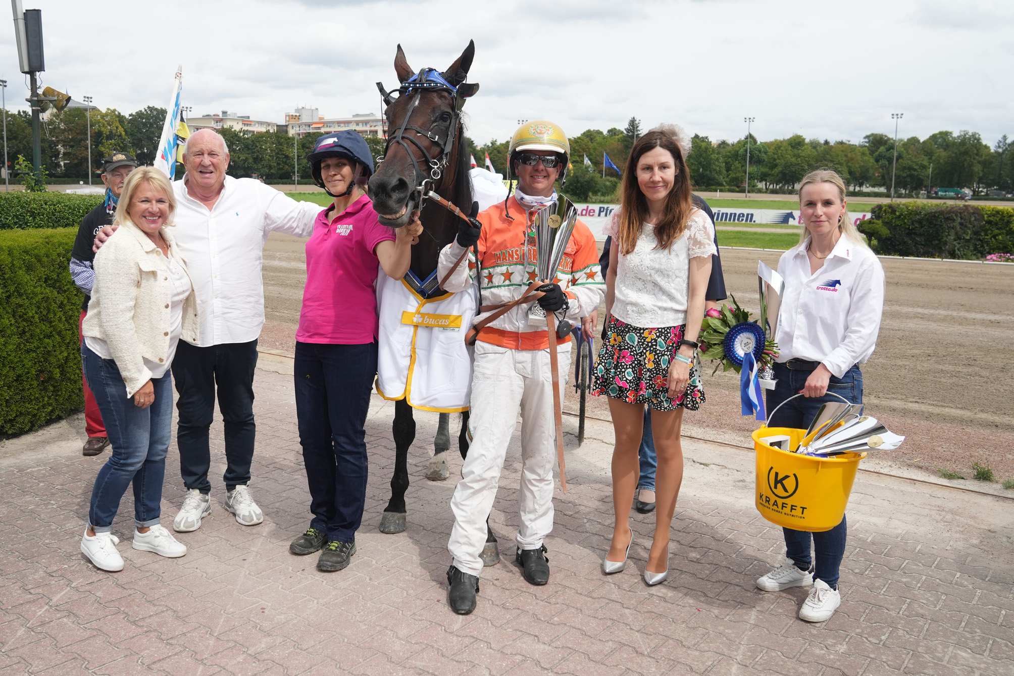 Schwer beschäftigt waren die Amateure, die maximal fünf Mal in den Sulky klettern konnten. Höhepunkt für den „Nachwuchs“, der durchaus etwas älter sein, aber nicht mehr als 24 Rennen gewonnen haben durfte, war das neugeschaffene Dambos-Erster-Rennen. Mit ihm wird an jenen 41-fachen Sieger erinnert, mit dem Deutschlands Besitzerchampionesse Karin Walter-Mommert 1998 das renommierte Fritz-Brandt-Rennen an ihre Fahne geheftet hat.