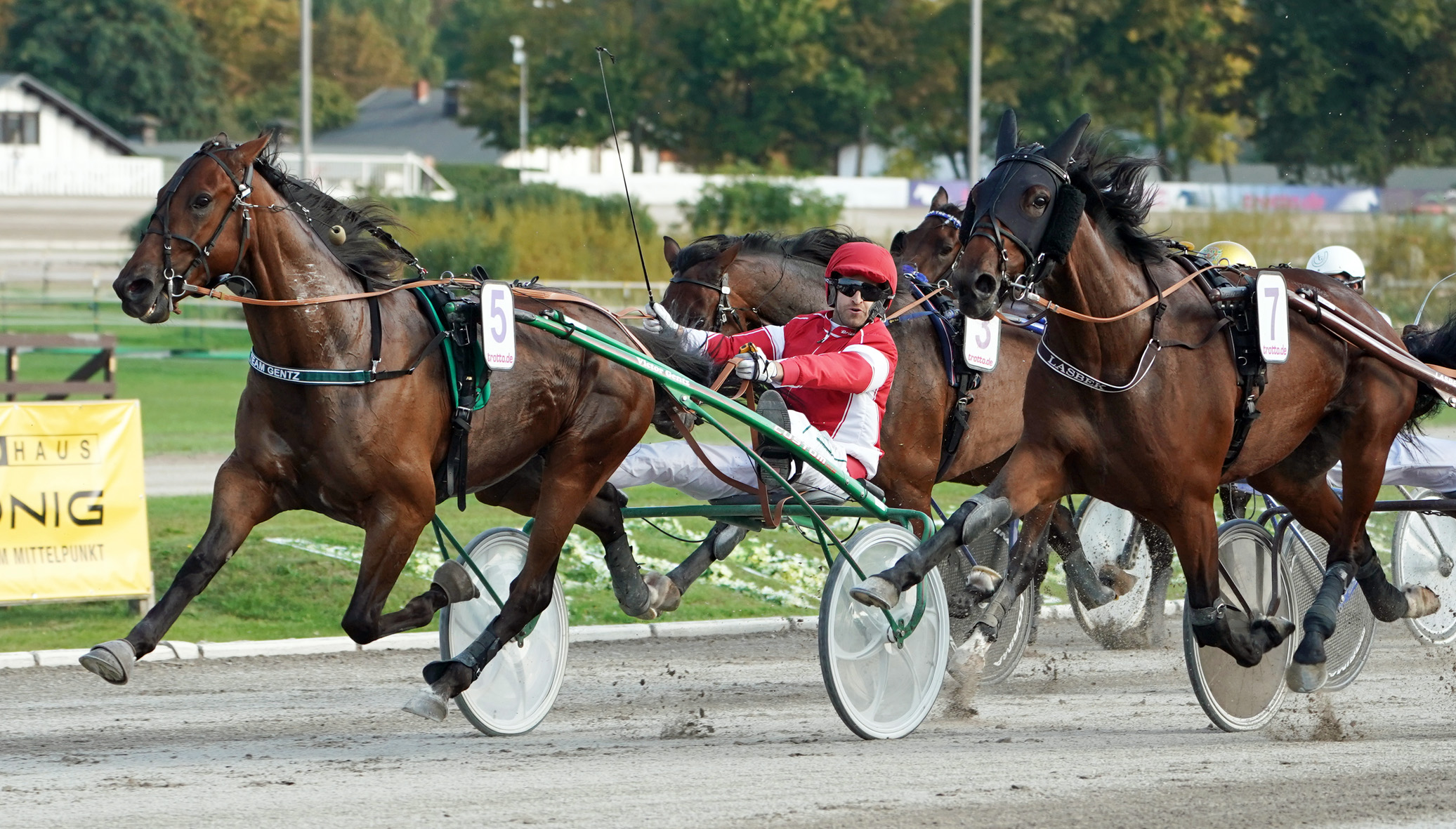 Keinerlei Probleme mit seinen Gegnern hatte der von Michael Nimczyk vorgetragene Favori de la Basle. Der Deutsche Meister begnügte sich unterwegs lange mit der vierten Position, als er dann aber aus dem Schlussbogen heraus das Tempo forcierte, stellte sein Schützling die Zeichen sofort auf Sieg. Der manchmal nicht ganz einfache Traber präsentierte sich somit von seiner Sonnenseite und ließ sich aus dem Feld heraus steuern, ohne sich auch nur im Geringsten zickig zu zeigen.