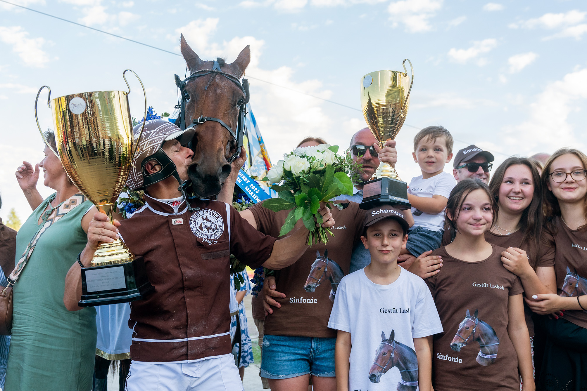 Für Franzl Genugtuung pur, denn nach seinem ersten Sieg mt Dream Magic BE im deutschen Skandal-Derby 2012, das er am Grünen Tisch gewonnen hatte, hatten sich auch Pfiffe unter den damals spärlichen Beifall gemischt. Diesmal paradierten Franzl und sein Team im grenzenlosen Jubel.