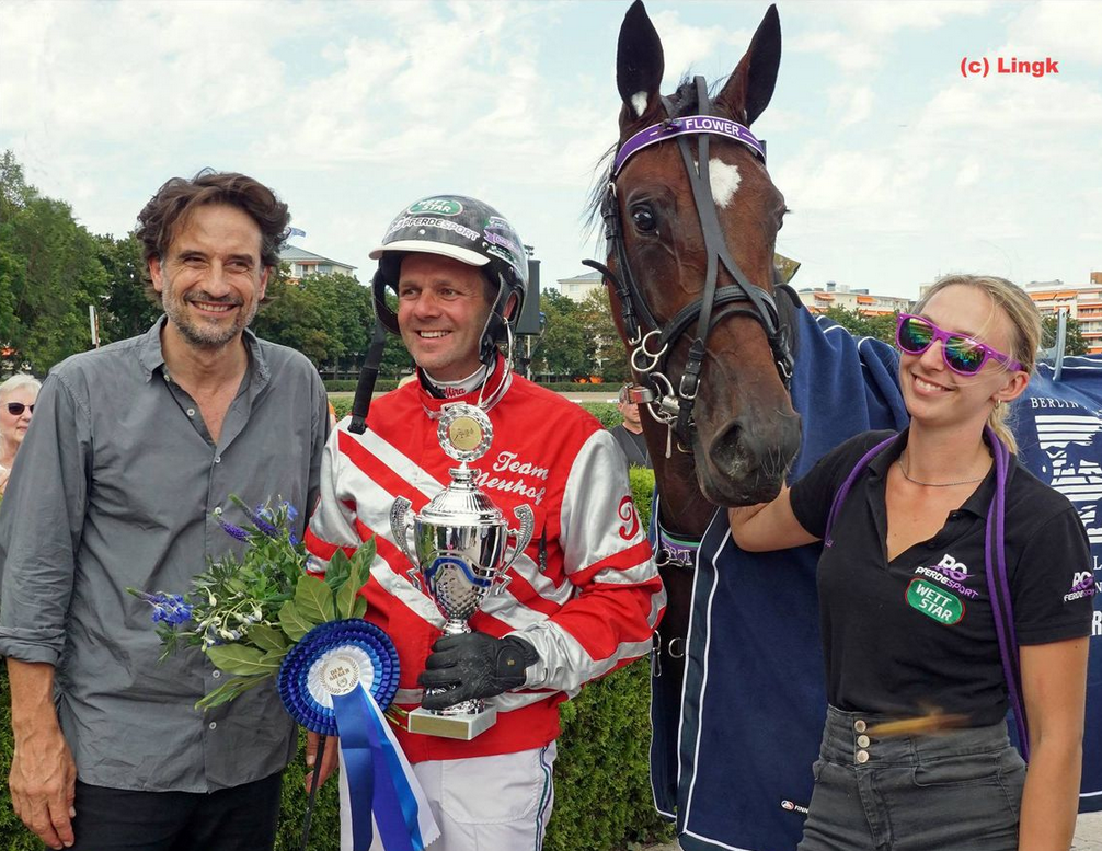 Und dann kam plötzlich die „Mini-Traberin“ Sunset boulevard auf Touren. Die kleine Maharajah-Tochter mit dem großen Kämpferherz schien einen Schalter umzulegen und lieferte einen Endspurt vom Feinsten ab, dem auch Grand Ready Cash nicht gewachsen war. Michael Nimczyk zollte ihr großen Respekt: „Man kann sich stets darauf verlassen, dass sie alles gibt.“ Mit diesem ihrem sechsten Sieg zog sie in den Kreis der 100.00-Euro-Trotter ein: 111.356 Euro weist ihr Konto aus.