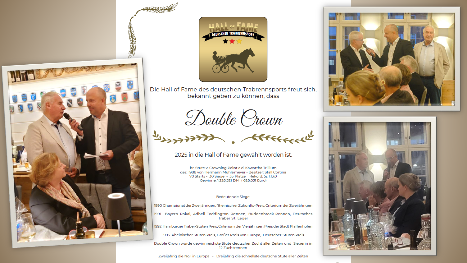 Überdies wurde vier Mal das "Silberne Hufeisen" für besondere Verdienste im Trabrennsport und der Traberzucht verliehen.