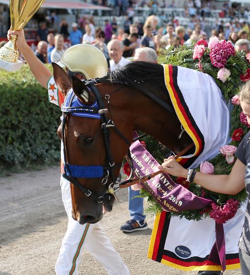 100 Meter nach dem Start dürfte der Adrenalin-Spiegel zumindest der äußeren Beteiligten Richtung Normalmaß gefallen sein, denn La Grace setzte mit dem ersten Schritt alle Hoffnungen wie ein altgedienter Profi um. Leichtfüßig und ohne einen wackligen Moment spritzte die Tochter der Le Rêve (der Traum) sofort nach vorn, während Klingande beim „Ab“ im Galopp „out“ war, und konnte sich alles ohne mit der Wimper zu zucken einteilen. Jetway Fortuna, Brightlands und Gaja folgten ihr innen, erst Jessy Schermer, dann Jeanet Newport, schließlich Janske Beemd waren die Zugpferde in Spur zwei, wodurch Rock my Dreams, als Einzige zur etwas ernsthafteren Herausforderin der Nimczyk-Stute erkoren, immer weiter aus dem Blickfeld geriet. Als Josef Franzl schließlich nach einer Runde in dritter Spur zu vorderen Ufern aufbrach, war es gar kein Problem für La Grace, fast spielerisch zuzulegen. Ohne einen Handschlag ihres Piloten kontrollierte sie, „die alles hat, was ein exzellentes Rennpferd braucht: Mut, Trabsicherheit, Kapazitäten und ein tolles Nervenkostüm“, Zeit, Gegner und Raum. So überlegen, wie „Meiki“ seinen ersten Derby-Titel einfuhr, sicherte sich Josef Franzl mit Rock my Dreams für eigene Kasse den Ehrenplatz vor Jetway Fortuna, für die Cees Kamminga keine bessere Lokomotive als „die Begnadete“ hätte finden können. Gaja und Brightlands holten, konsequent innen auf Arbeit, die Prämien vier und fünf.