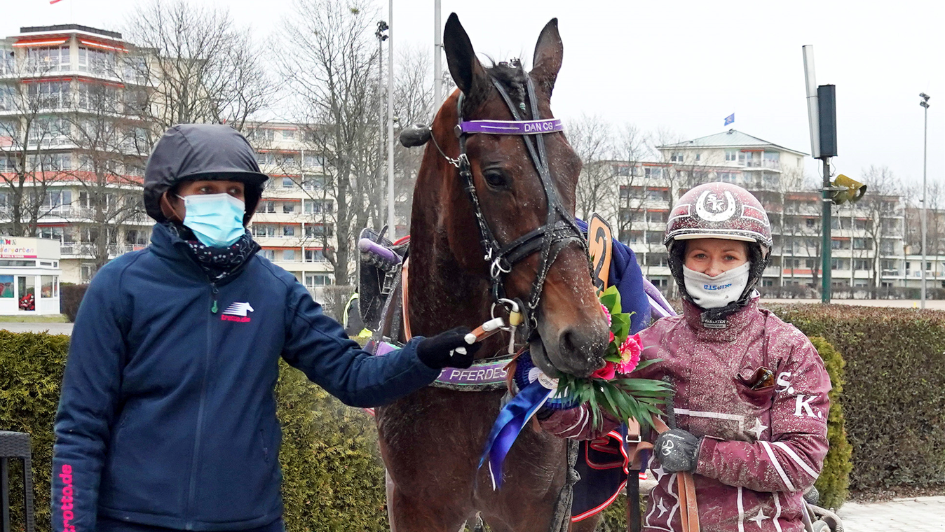Eine der neun Prüfungen war für die Amateure vorbehalten – und sie wurde zu einer Gala für Sarah Kube und Dan CG. Der Wallach verkniff sich diesmal alle Eskapaden und harmonierte mit der mehrfachen Deutschen Meisterin, die ihn erstmalig im Rennen steuerte, einfach perfekt. Als ihm Sarah Kube mit Erreichen der Gegenseite den Kopf freigegeben hatte, schoss Dan CG wie ein Blitz am gesamten Feld vorbei und stürmte in der Tagesbestzeit von 14,9/1.900m mit dreieinhalb Längen Vorsprung vor San Pardo (Sebastian Gläser) über die Linie. Ein überlegener Erfolg!
