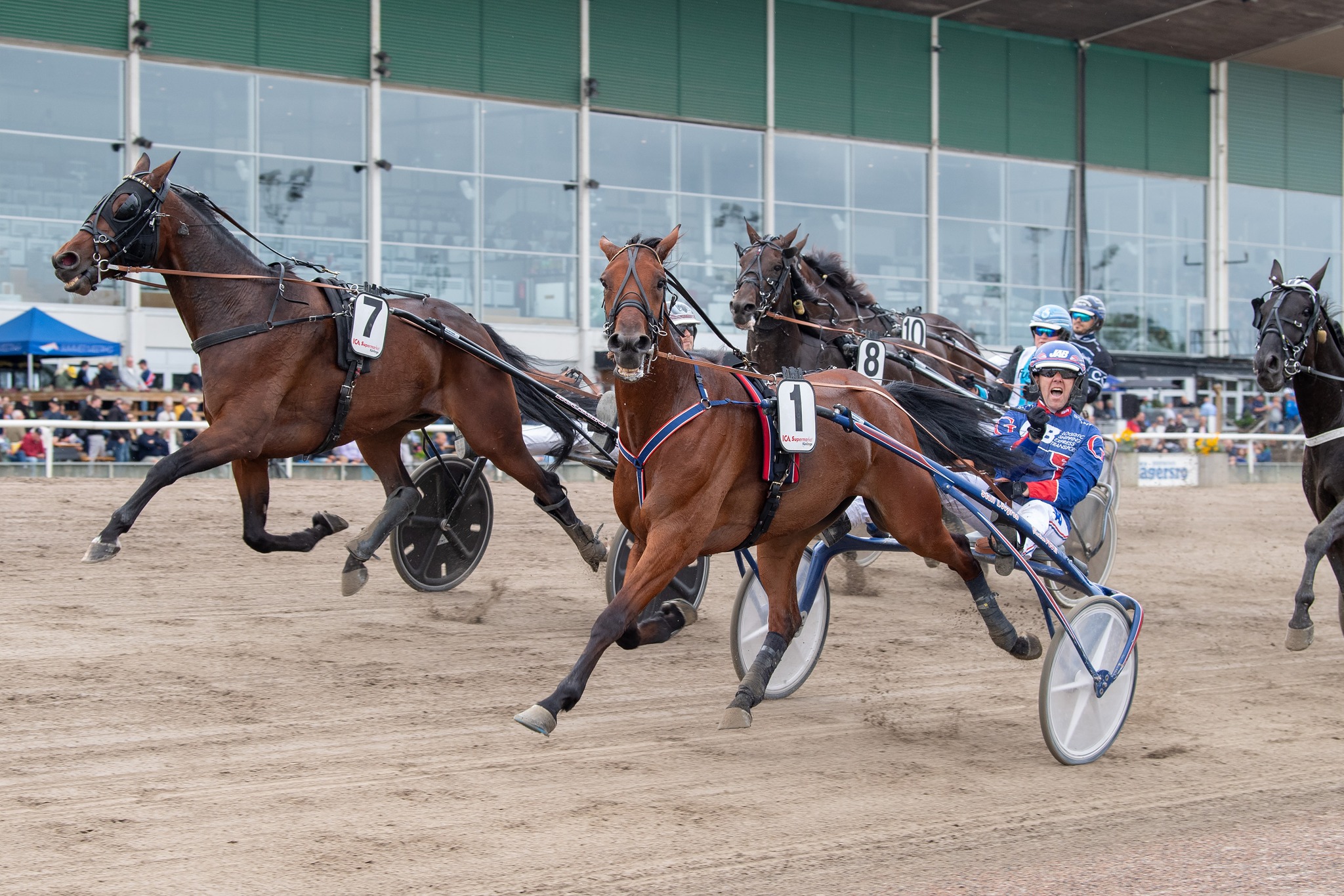 Keinen Freiraum hatte ihr für 662:10 abgegangener US-Wallach Sunrise im dritten Paar innen, als auf der 1.640-Meter-Sprintdistanz die Entscheidung reifte, so dass er sich mit 11.500 SEK für Platz fünf begnügen musste. Auf seine Weise revanchierte sich Oscar Ginman an Conrad Lugauer, der seinem A Fair Day (1) mit Laban Lagö (5) im ersten Bogen beim noch nicht entschiedenen Kampf um die Spitze wenig fair rigoros vor die Füße gefahren war. Nach 600 Metern nach außen beordert, raufte sich der Maharajah-Sohn um eine halbe Länge vorbei zum achten, mit 100.000 SEK belohnten Erfolg. Der mit hohen Ambitionen angereiste Kosmos Renka (2) kam in der Startphase aus dem Takt.