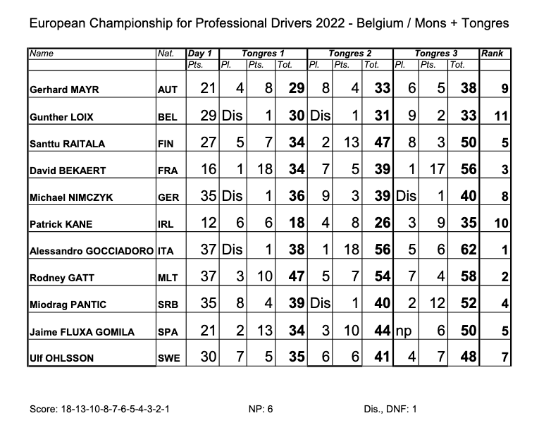 Alessandro Gocciadoro (47), der am Vortag in Mons zwar sieglos geblieben war, aber mit guten Platzierungen kontinuierlich punktete, landete endlich einen Volltreffer, erhielt die volle Punktzahl und holte den nach Lauf 5 noch klar führenden Malteser Rodney Gatt nicht nur ein, sondern zog auch gleich vorbei.