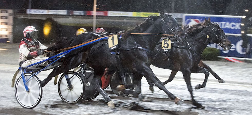 Zweifach war „Deutschland“ in der abschließenden Bronsdivisionen vertreten, die mit 1609 Metern für den auf Langstrecken bewährten U R Amazing eindeutig zu kurz war. Ohnehin nur im Hintertreffen untergekommen, sprang der Wallach, der kürzlich in Momarken ein 4200-Meter-Rennen gewonnen hatte, eingangs der Zielgeraden im Bemühen um eine kleine Prämie zur roten Karte. Sehr viel besser versah sein unterwegs direkt vor ihm liegender Landsmann Hakon von Haithabu den Dienst. Ulf Ohlsson machte sich 600 Meter vor Schluss mit ihm auf den beschwerlichen Weg nach vorn und kämpfte die für den Takt verantwortliche Ursula Horse um einen „Hals“ nieder. Frische 125.000 NKR klapperten im Säckel des seit 14 Monaten für schwedische Interessen laufenden Wikingers.