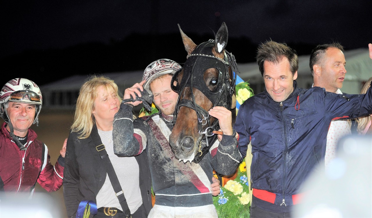 Dafür strahlte nach diesem verregneten Abend, der nur 4.312 Zuschauer auf die Bahn lockte, ein Quartier über alle Backen, für das es in den letzten Monaten überwiegend schwere Backpfeifen gegeben hatte. Zehn Jahre nach Vater Lutfi, der 2009 mit Lavec Kronos triumphiert hatte, machte Sohn Adrian Kolgjini, der nun offiziell fast komplett das Trainergeschäft übernommen hat, auf das Favoritensterben den Deckel drauf und legte die Gegner schwer aufs Kreuz mit Tae Kwon Deo, der fast schon als Fehleinkauf verbucht worden war. 240.000 Dollar hatte Lutfi Kolgjini für den nach Duboisschen Gesichtspunkten gezüchteten Muscle-Hill-Sohn vor drei Jahren in Lexington auf den Tisch des Auktionshauses geblättert, später Anteile an die Whap Capital AB abgegeben. Da hatte der Dunkelbraune eine kleine Odyssee hinter sich. Zweijährig bei Kolgjini in Schweden ausgebildet, hatte er dort drei seiner fünf Starts als Sieger beendet und 2018 mit 242.000 Kronen die Ufer gewechselt, um jenseits des Atlantiks am großen Dreijährigen-Rad mit zu drehen. Viel kam dabei nicht heraus (umgerechnet 224.216 SEK aus sieben Auftritten), und auch bei der Retourkutsche in Europa war er bisher bei zwei Ehrenplätzen aus vier Versuchen und 87.500 Kronen Gage fast alles schuldig geblieben. (Foto: travnet.se)
